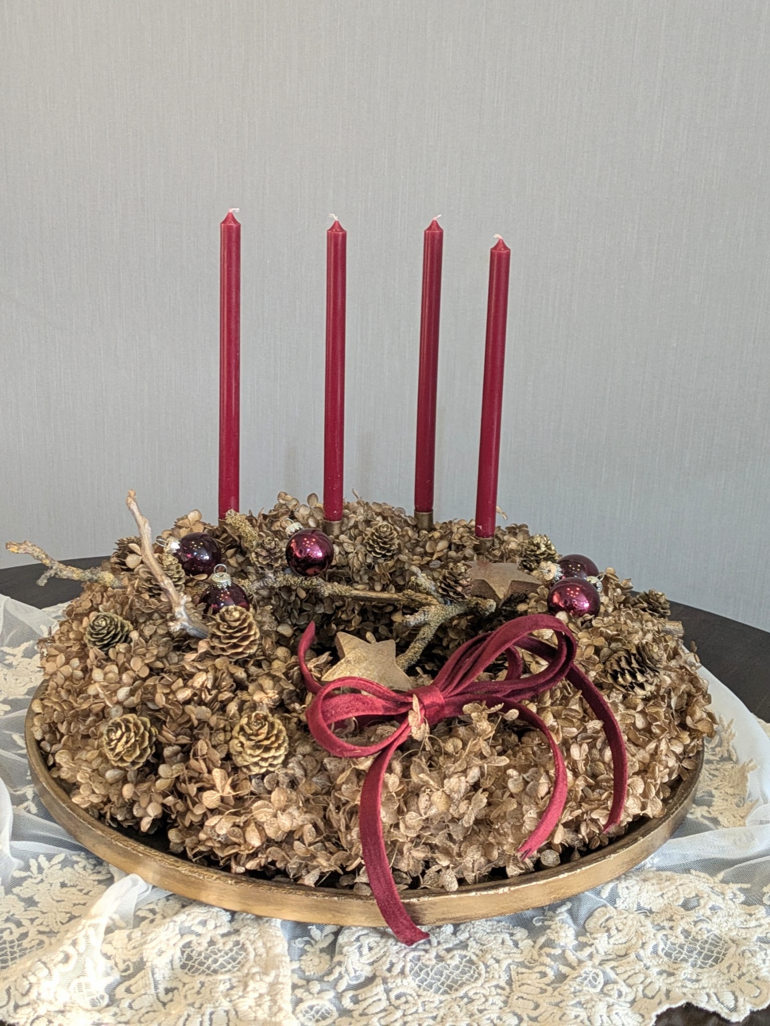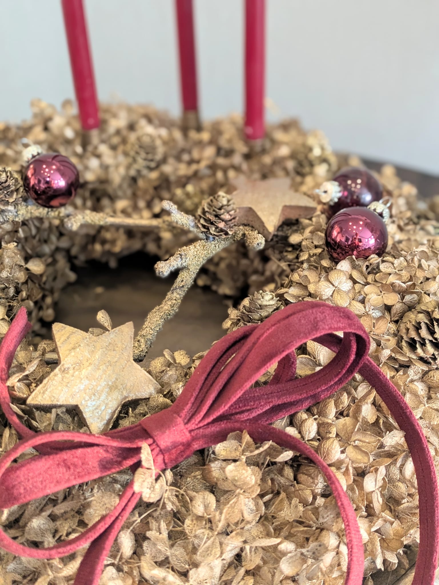 In Gold-Rot habe ich dieses Adventsgesteck gezaubert. Der Kranz wurde aus Gold gefärbten Hortensien gefertigt. Verziert mit Glaskugeln und Naturmaterialien sowie eine Samtschleife.