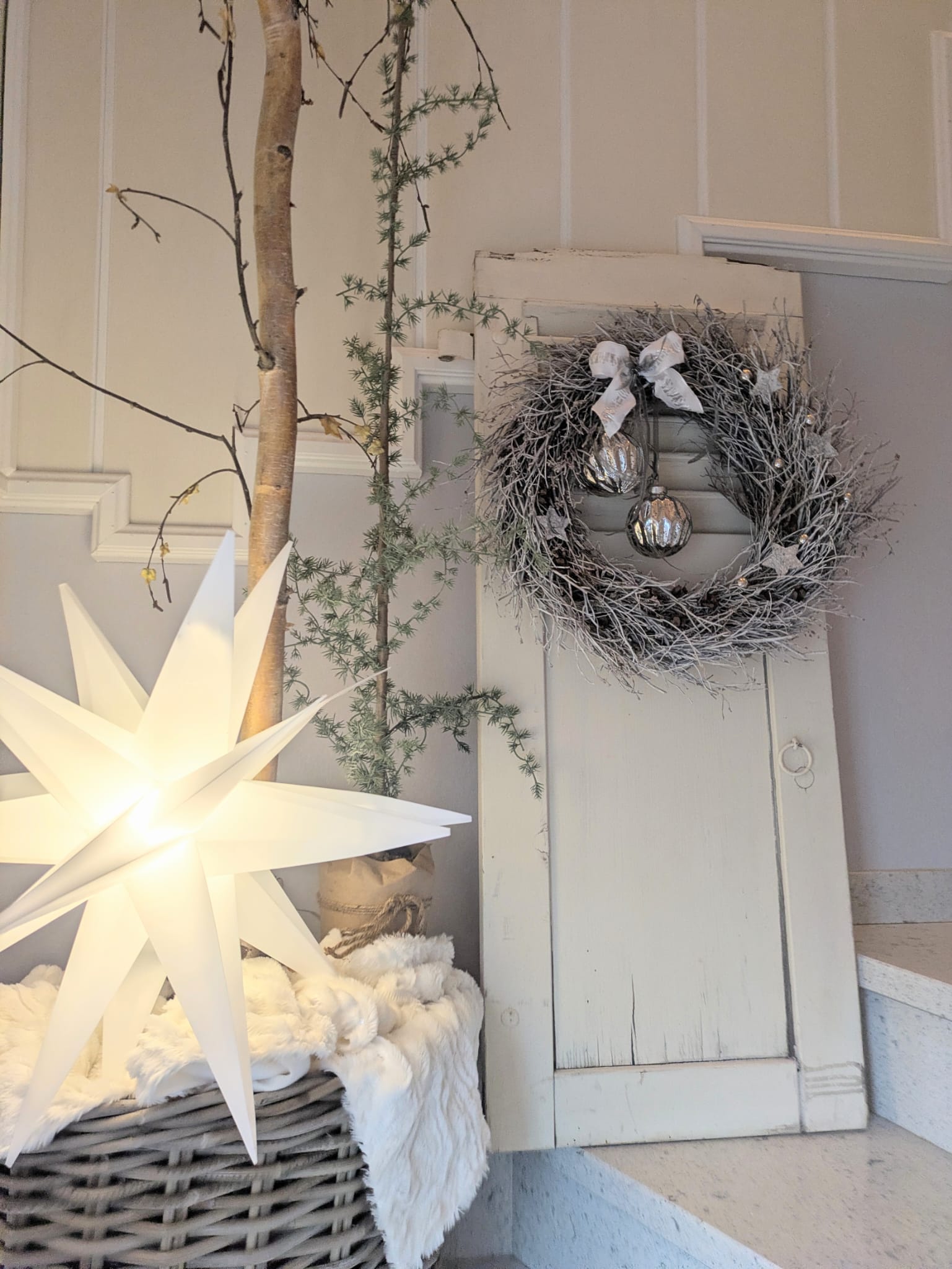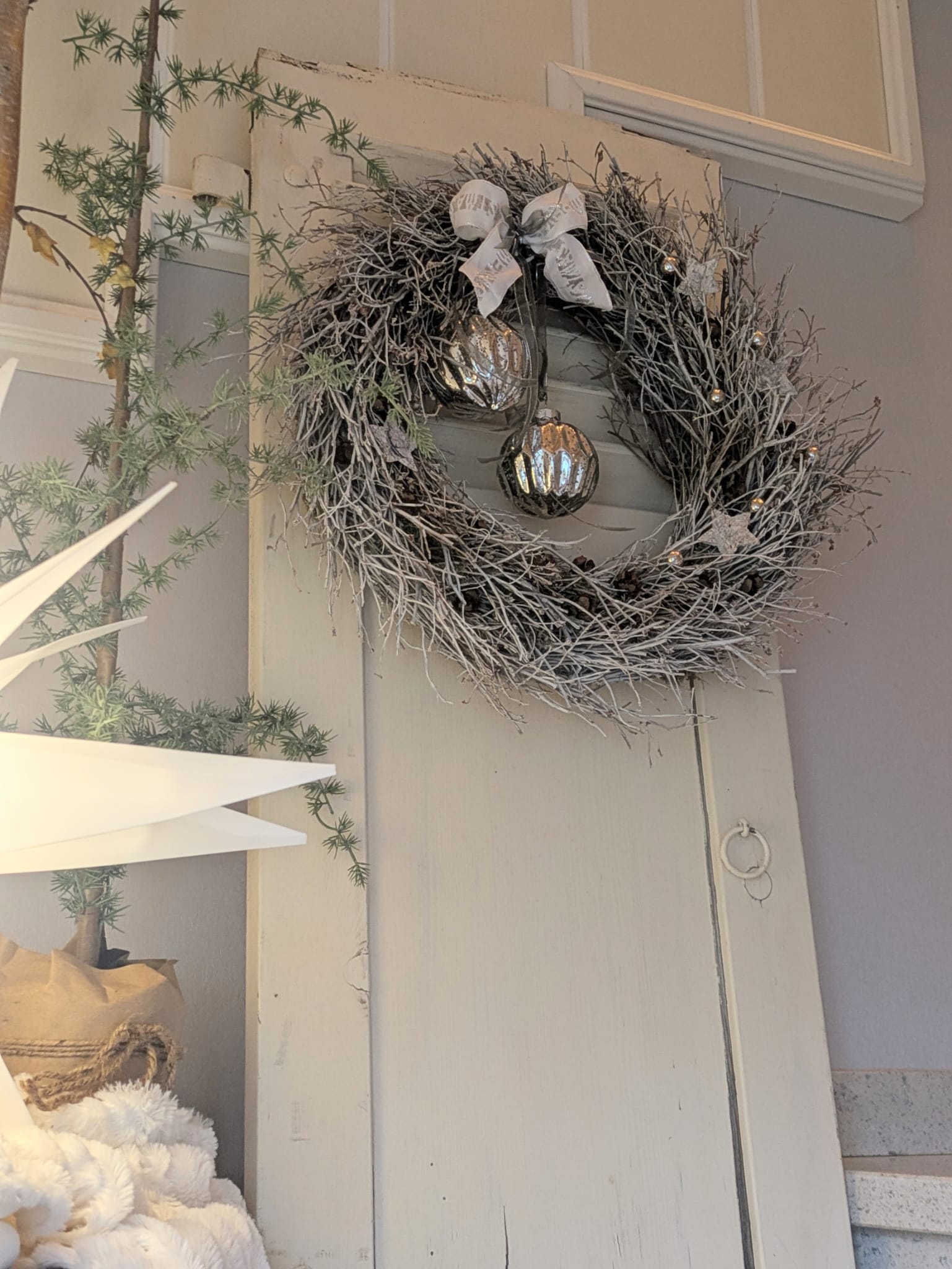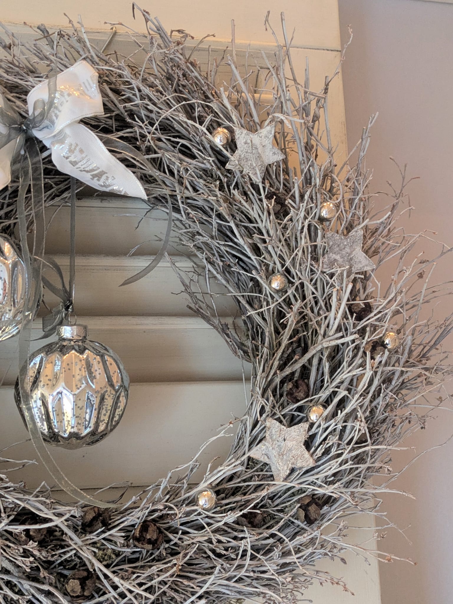 Diesen weihnachtlichen Kranz habe ich aus Heidelbeerkraut gezaubert. Und ihn mit Zapfen, Sterne aus Birkenrinde und kleine und große Kugeln verziert, sowie Schleifenband.