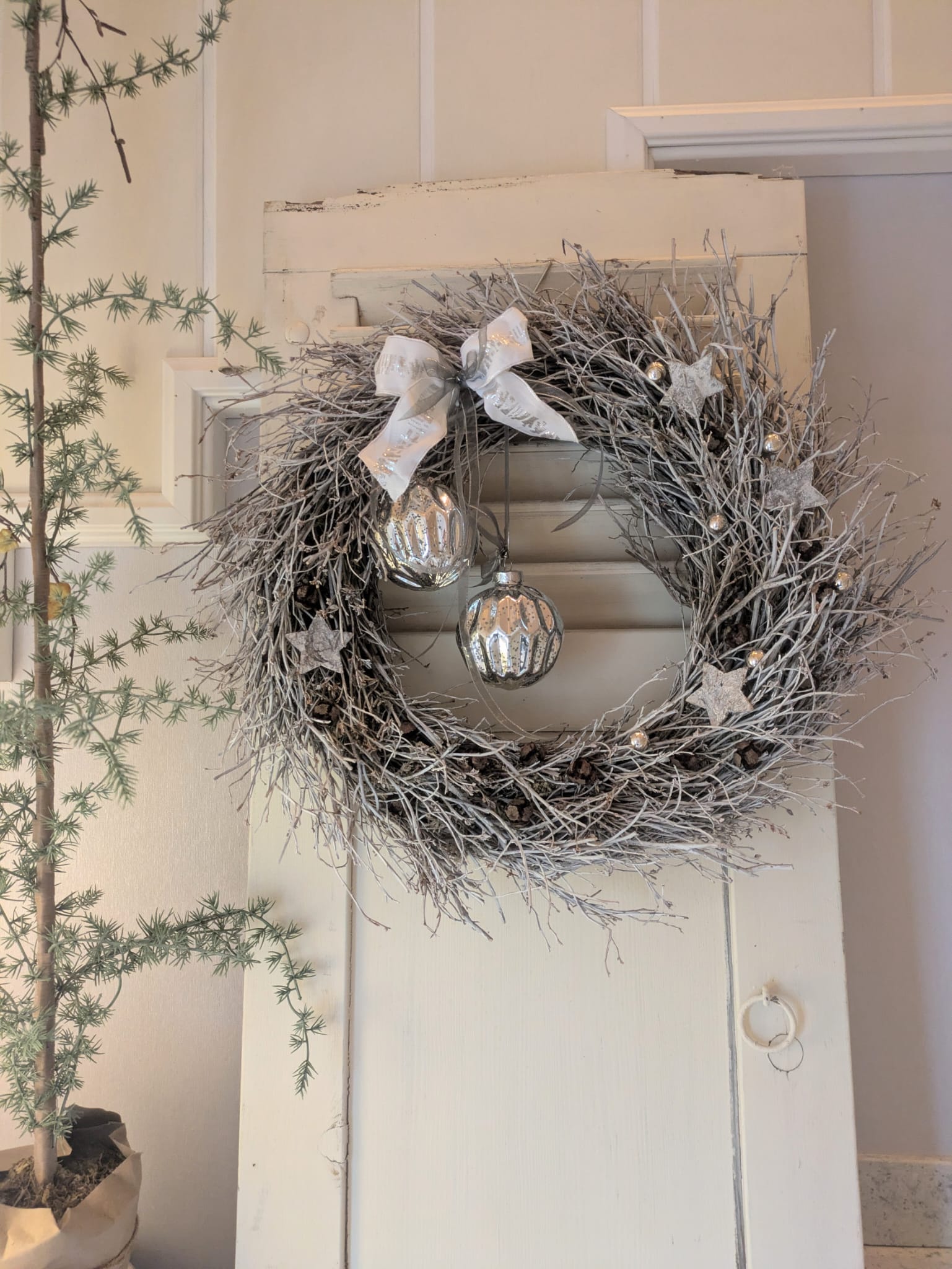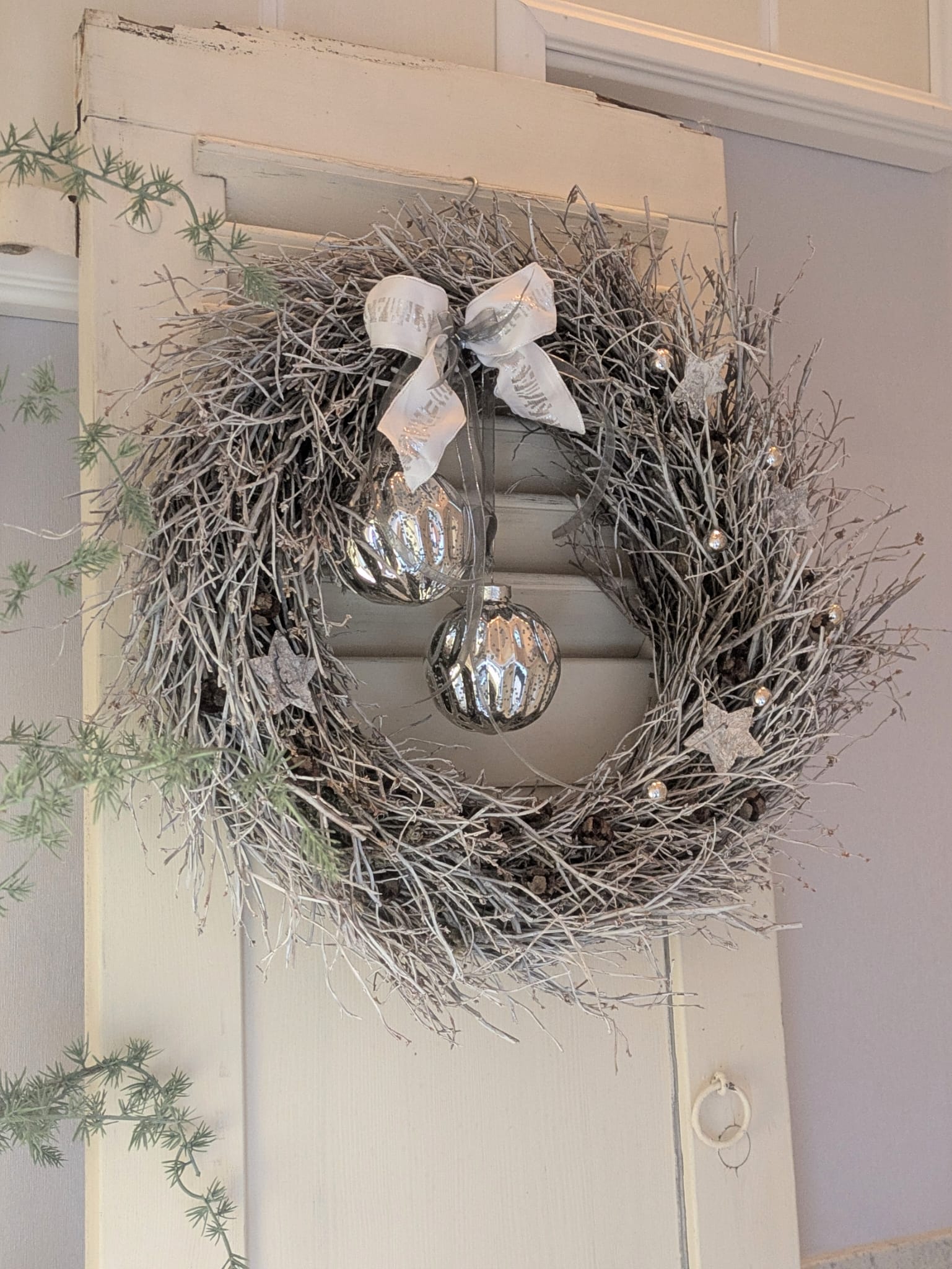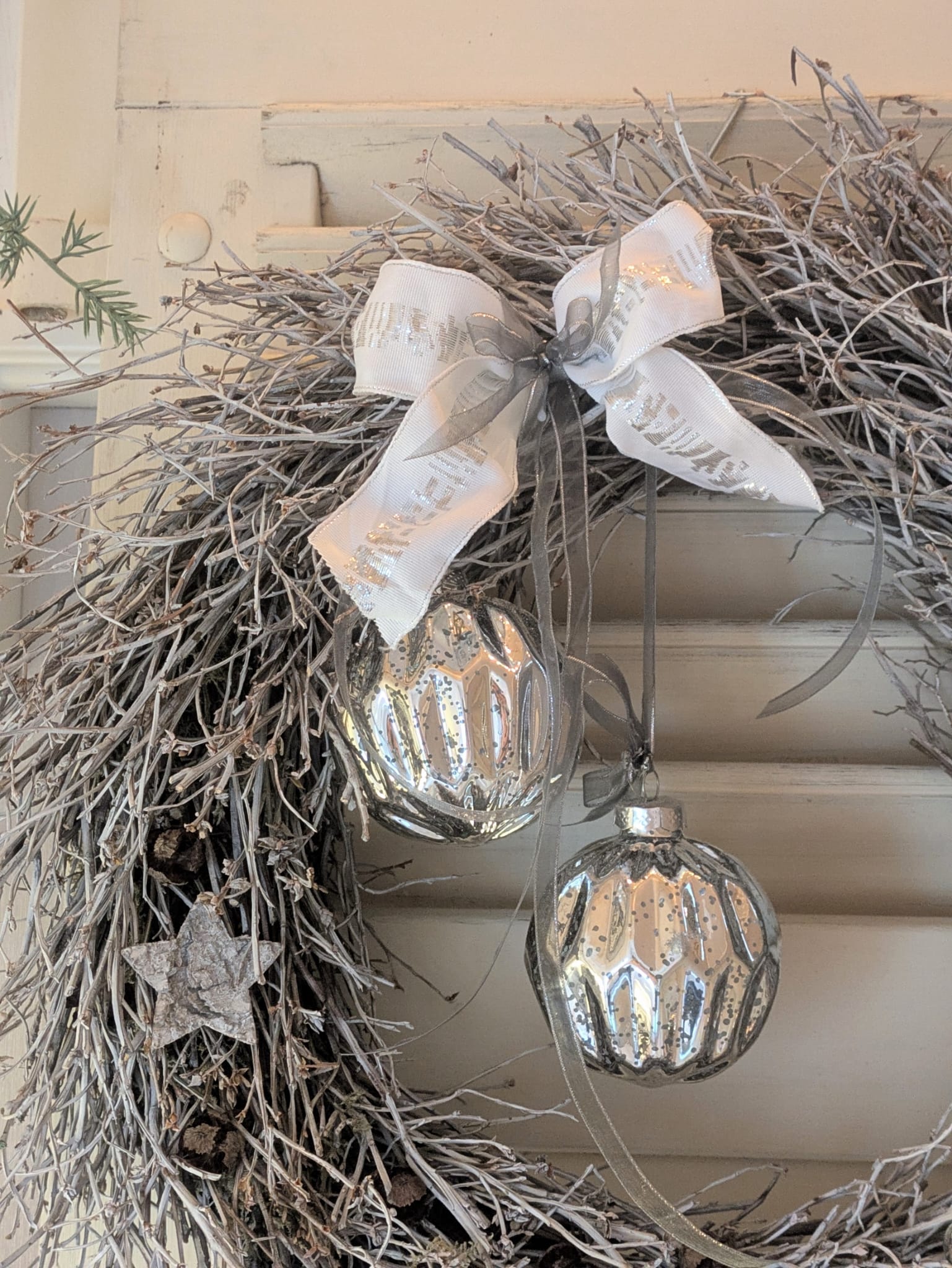 Diesen weihnachtlichen Kranz habe ich aus Heidelbeerkraut gezaubert. Und ihn mit Zapfen, Sterne aus Birkenrinde und kleine und große Kugeln verziert, sowie Schleifenband.