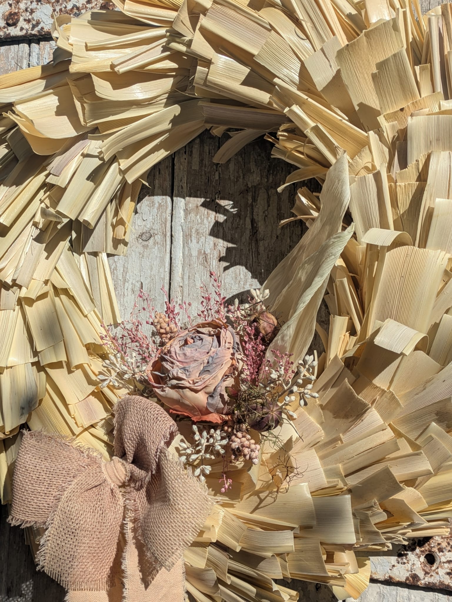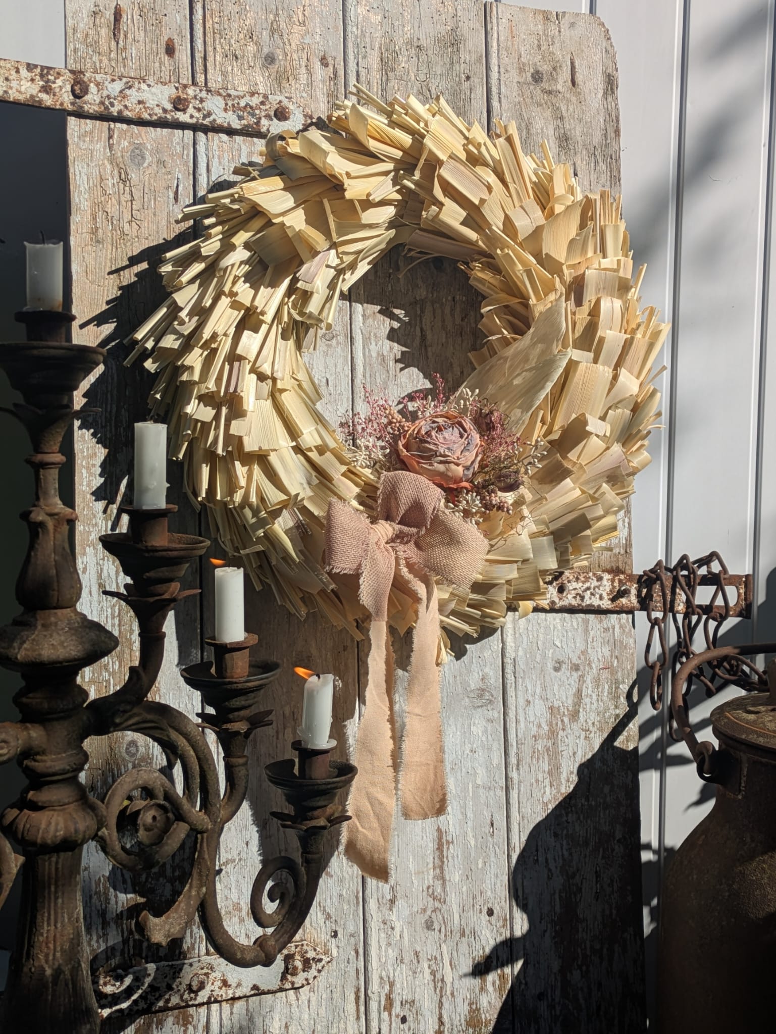 Dieser Kranz ist aus Pampasgras Blättern entstanden und habe in mit einer Seidenblume sowie Naturmaterialien verziert. Dazu passend eine Schleife ausgewählt.